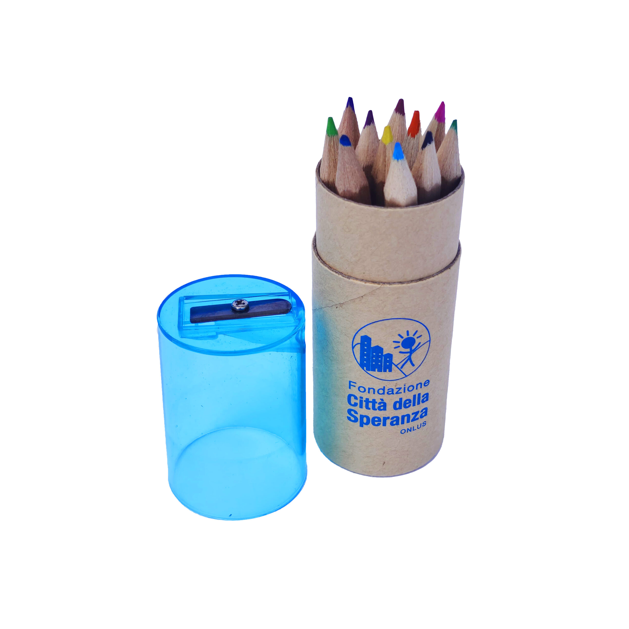 Set 12 matite colorate in carta riciclata in contenitore cilindrico con temperino e logo di Fondazione Città della Speranza.